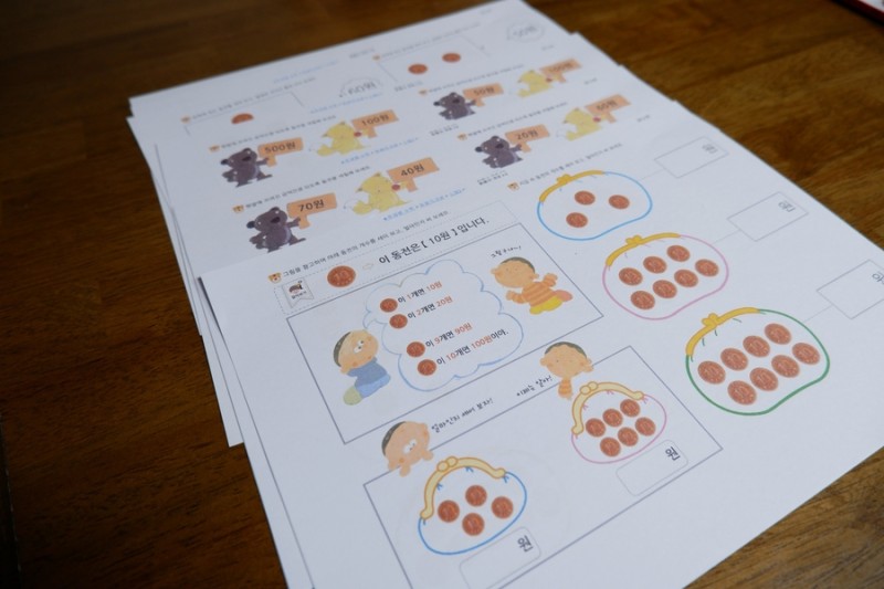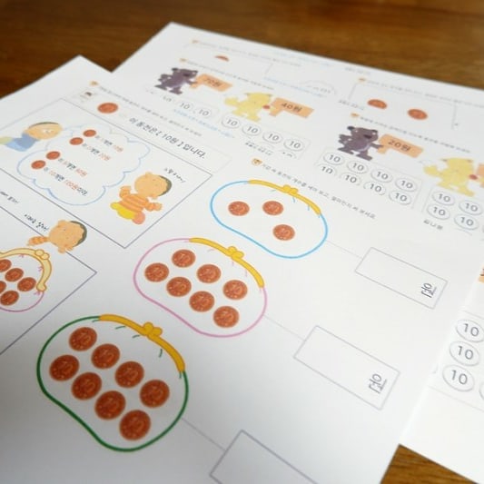 총9단계로 10원부터 50원, 100원, 500원까지 개념을 알려주고 셈을 해볼 수 있게 만들어진 프린트학습지