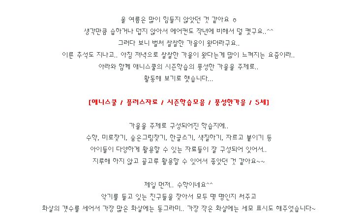 제목 [애니스쿨/시즌학습모음/5세]풍성한 가을을 주제로 가을에 대해 활동해 봤어요.