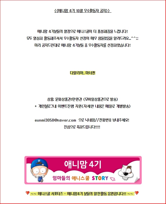 [공지] 애니맘 4기 10월 우수활동자 공지입니다. 당첨자 정보는 eunmi3058@naver.com으로 보내주세요.
