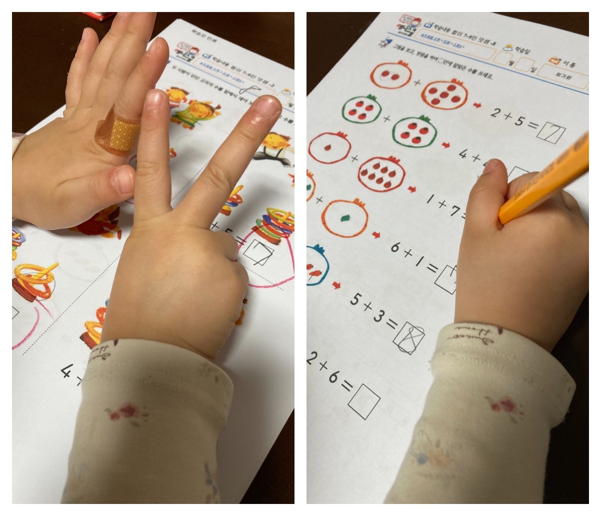수학 학습에 들어가요. 요즘 5~8까지의 덧셈을 하고 있는데요.