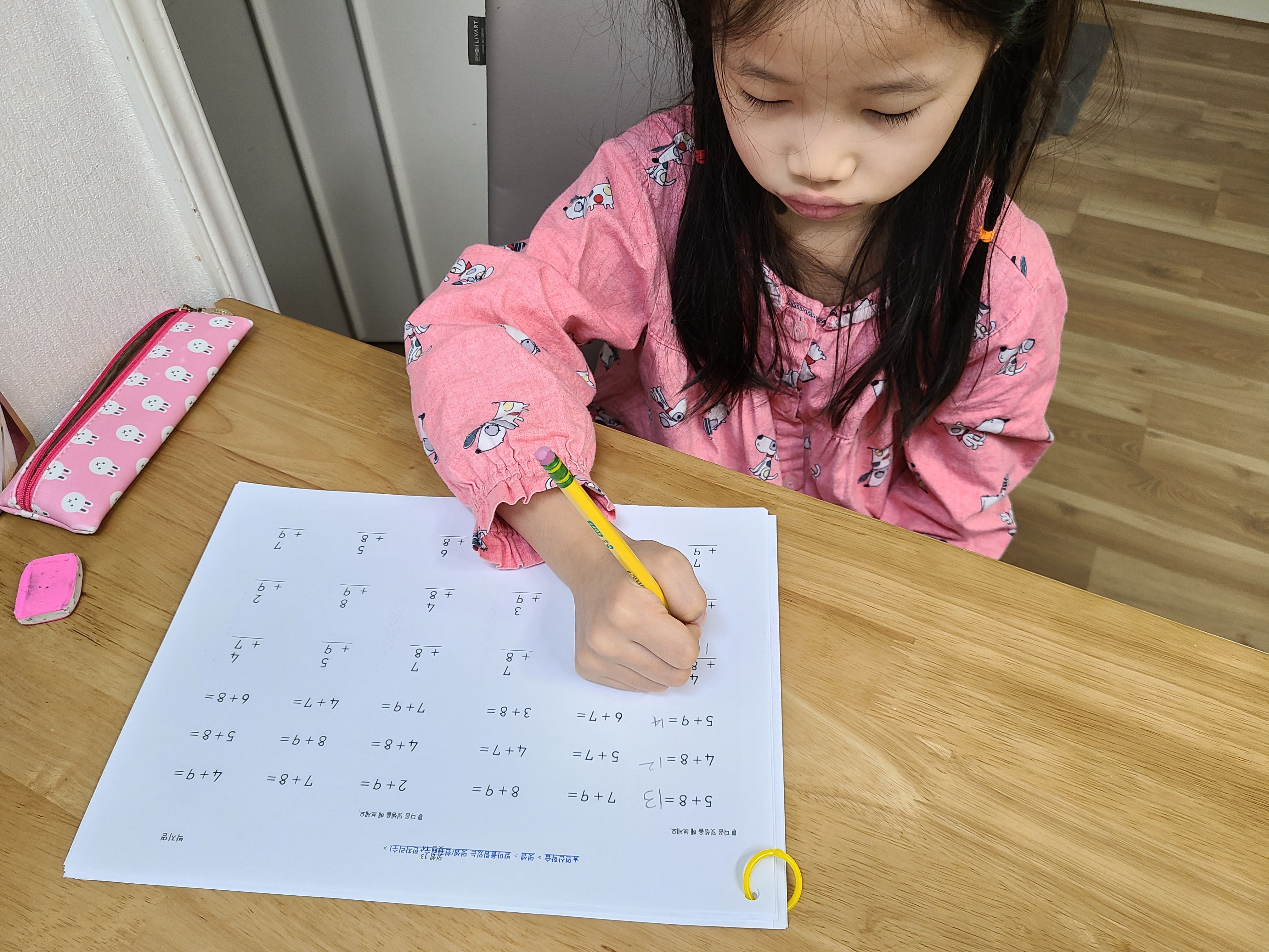 애니스쿨 연산학습에서 덧셈을 꾸준하게 하고 있어요. 아직 한자리수 끼리 더하는 받아올림이 있는 덧셈을 하고 있는데요. 반복해서 학습지를 풀게하고 있답니다~ ^^